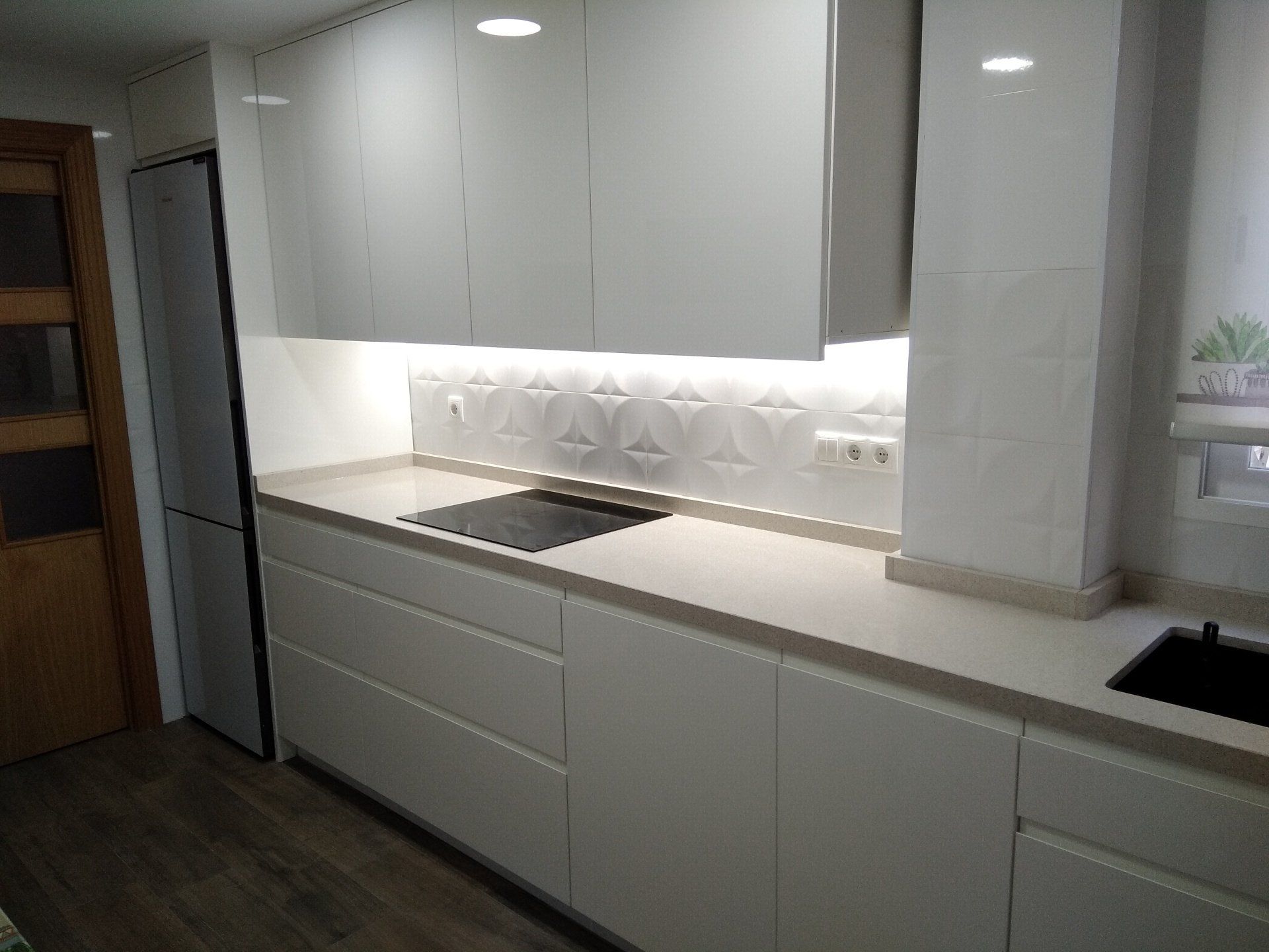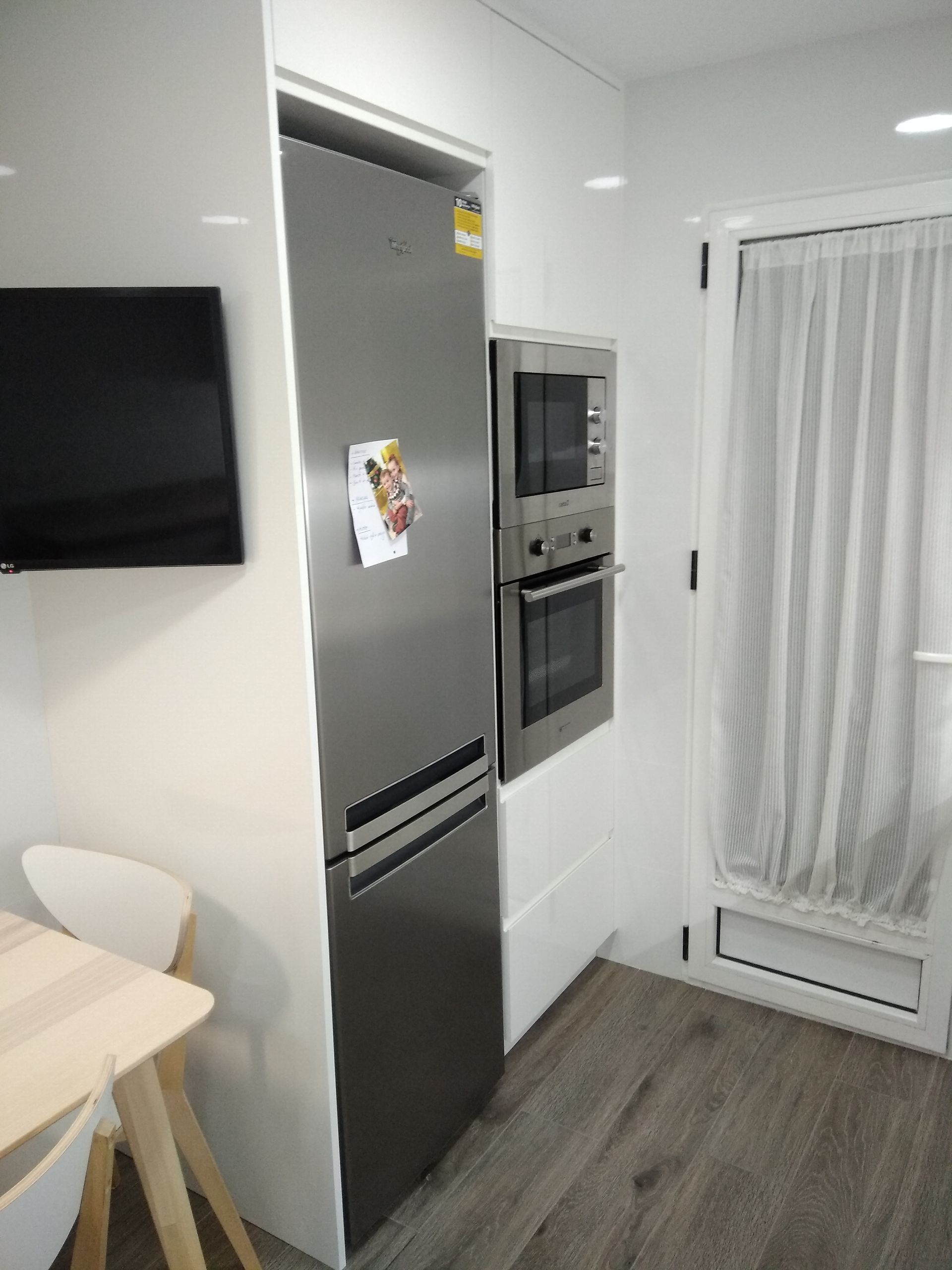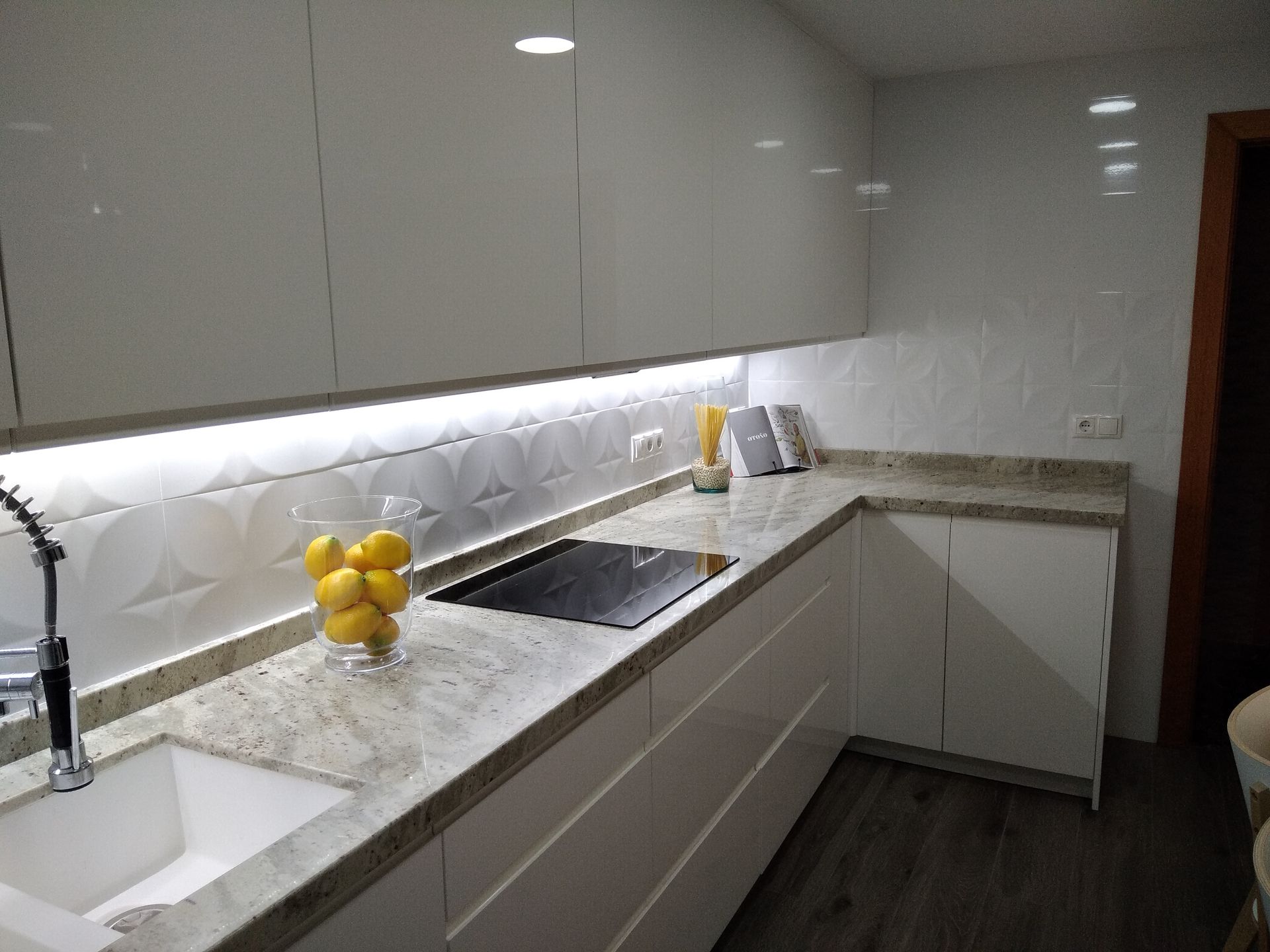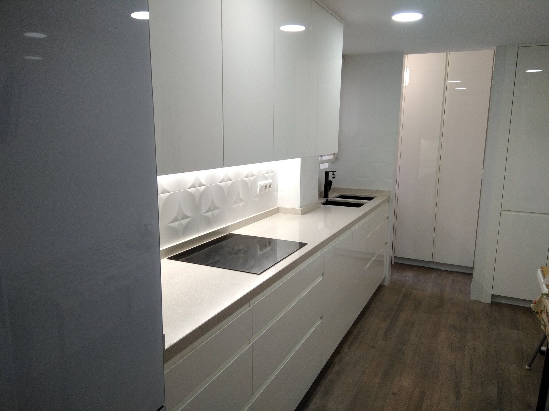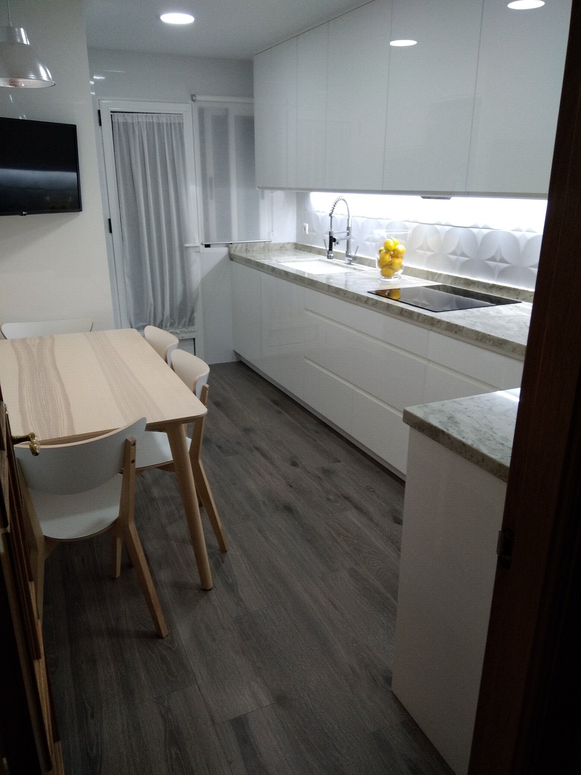 Se han utilizado revestimientos porcelánicos en blanco brillo, un frontal decorativo y un pavimento imitación madera. Armariada en serie LUXE blanco brillo con gran capacidad de almacenaje, tiradores tipo uñero, lavavajillas integrable, pila encastrada, columna de horno y microondas, tira de led encastrada en la armariada, conexión de televisión, dos ambientes de iluminación, bancada de granito de 4 cm de canto, colocación de pladur.