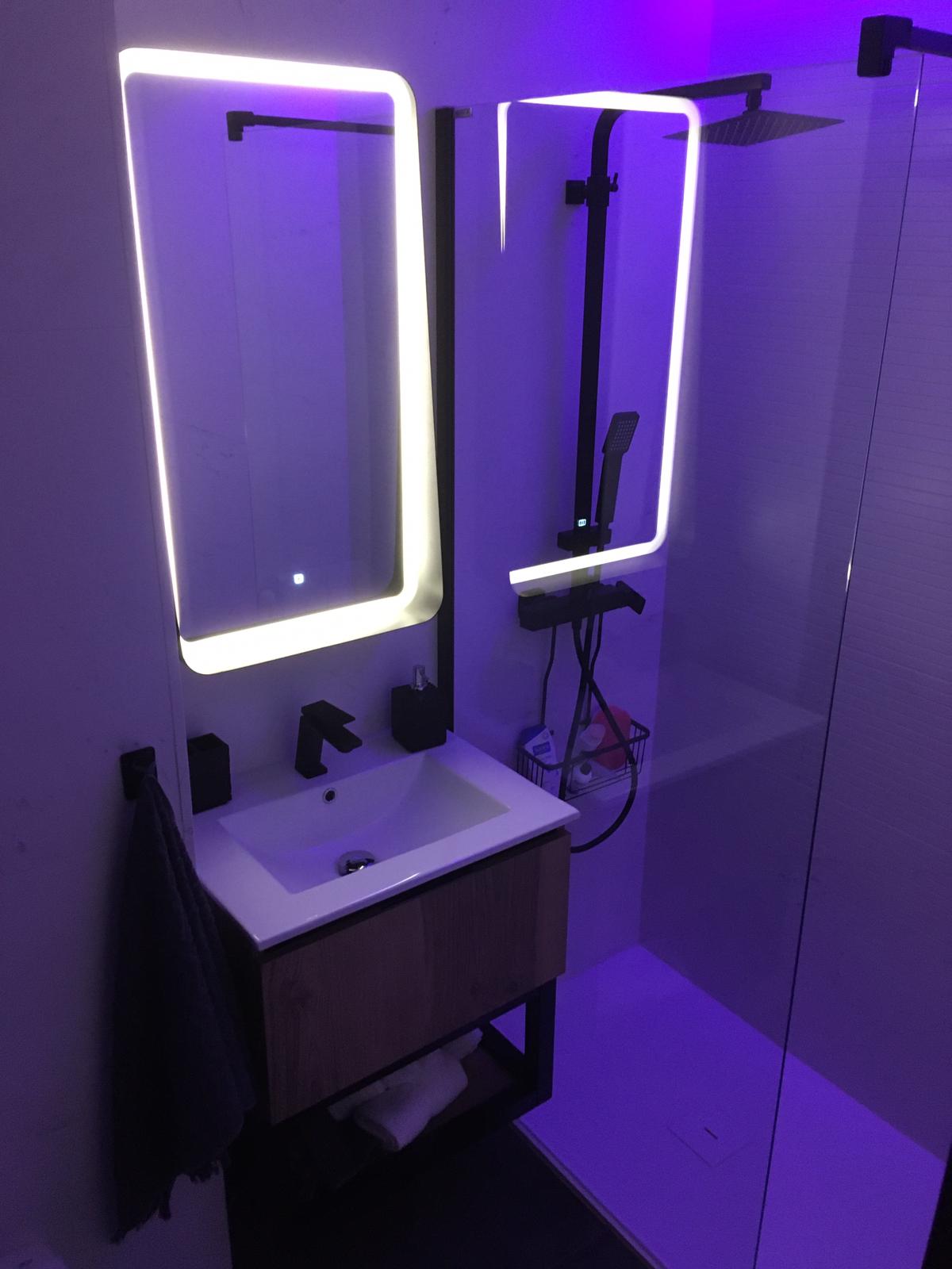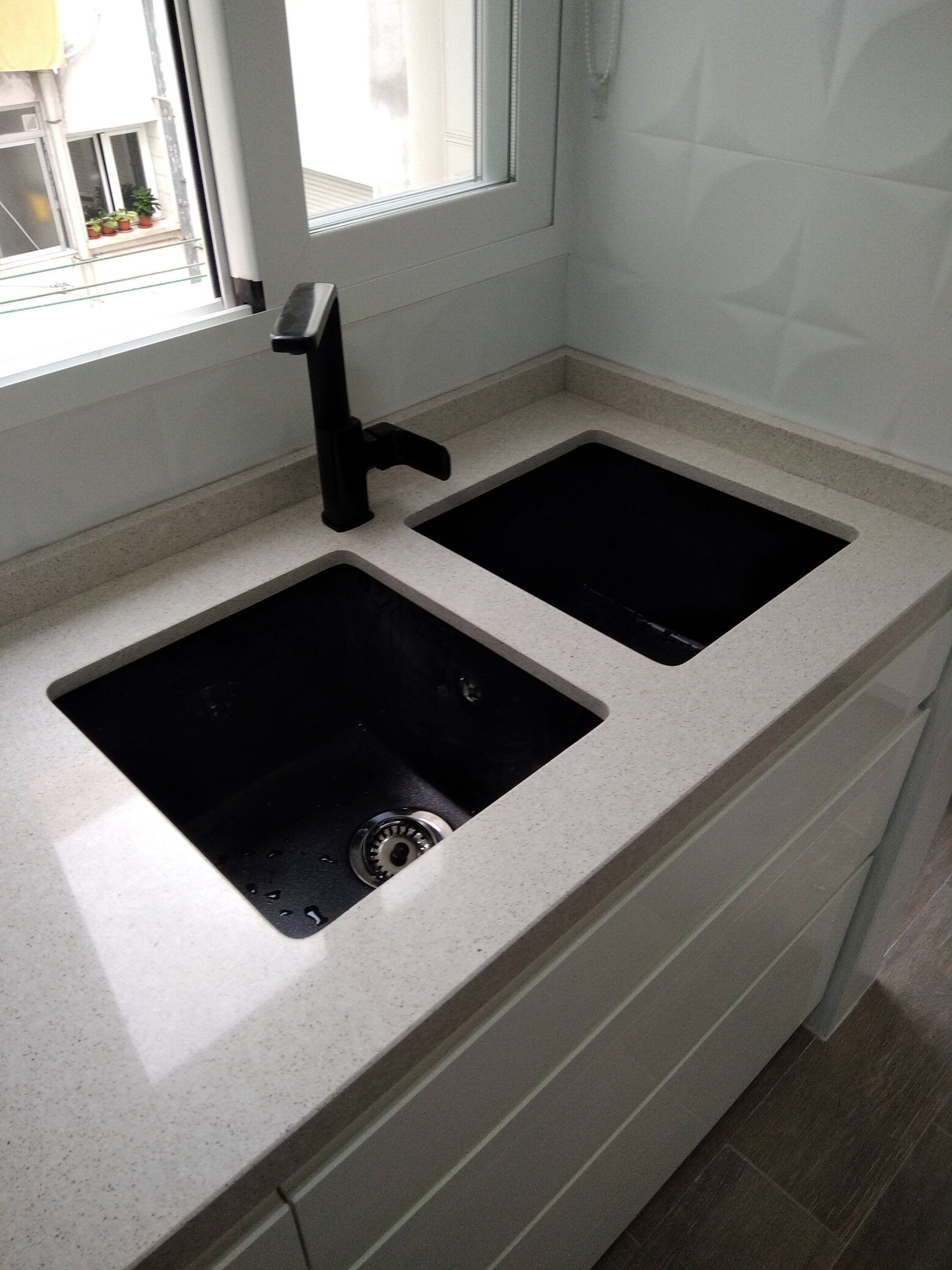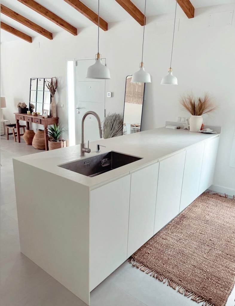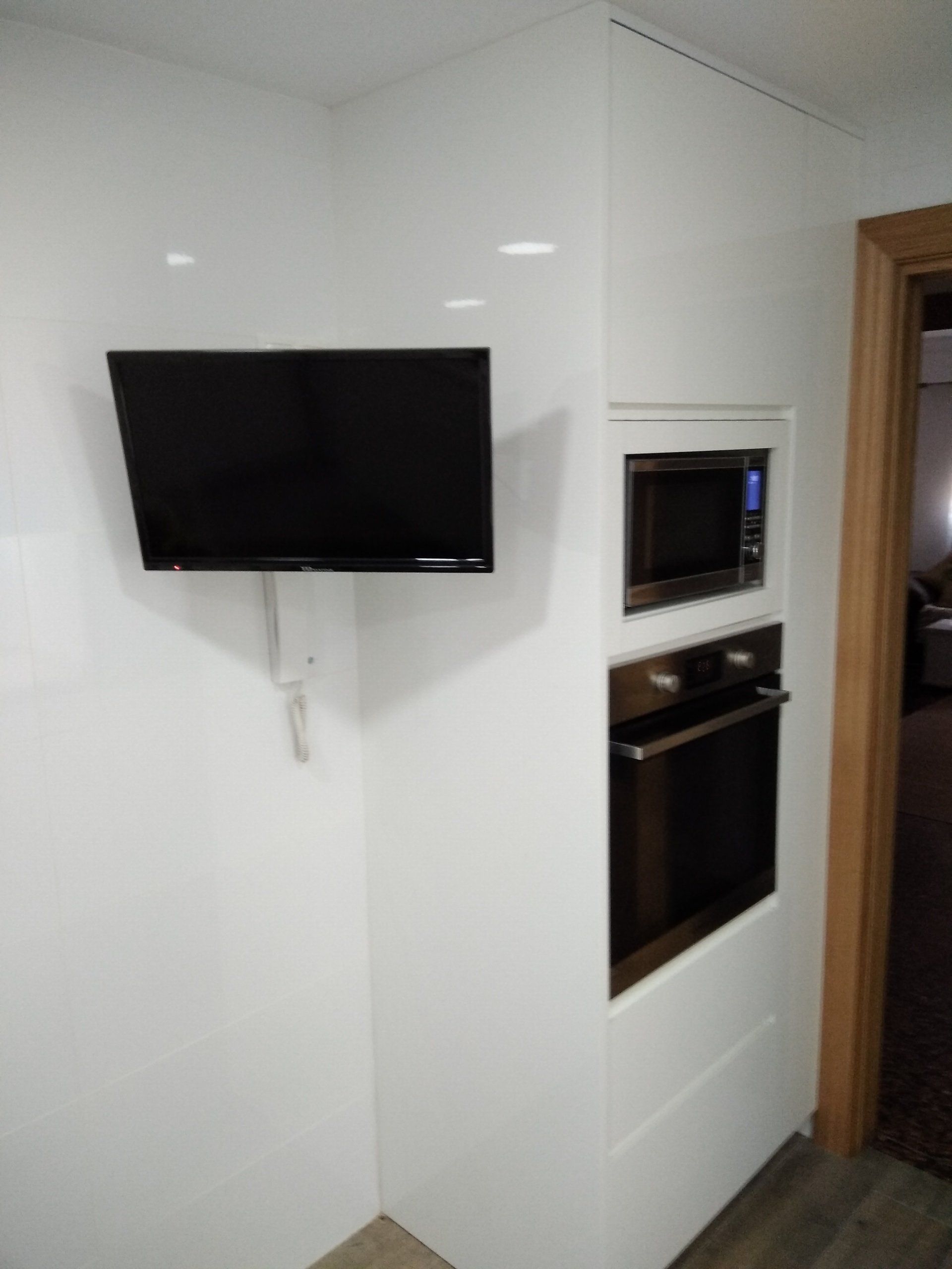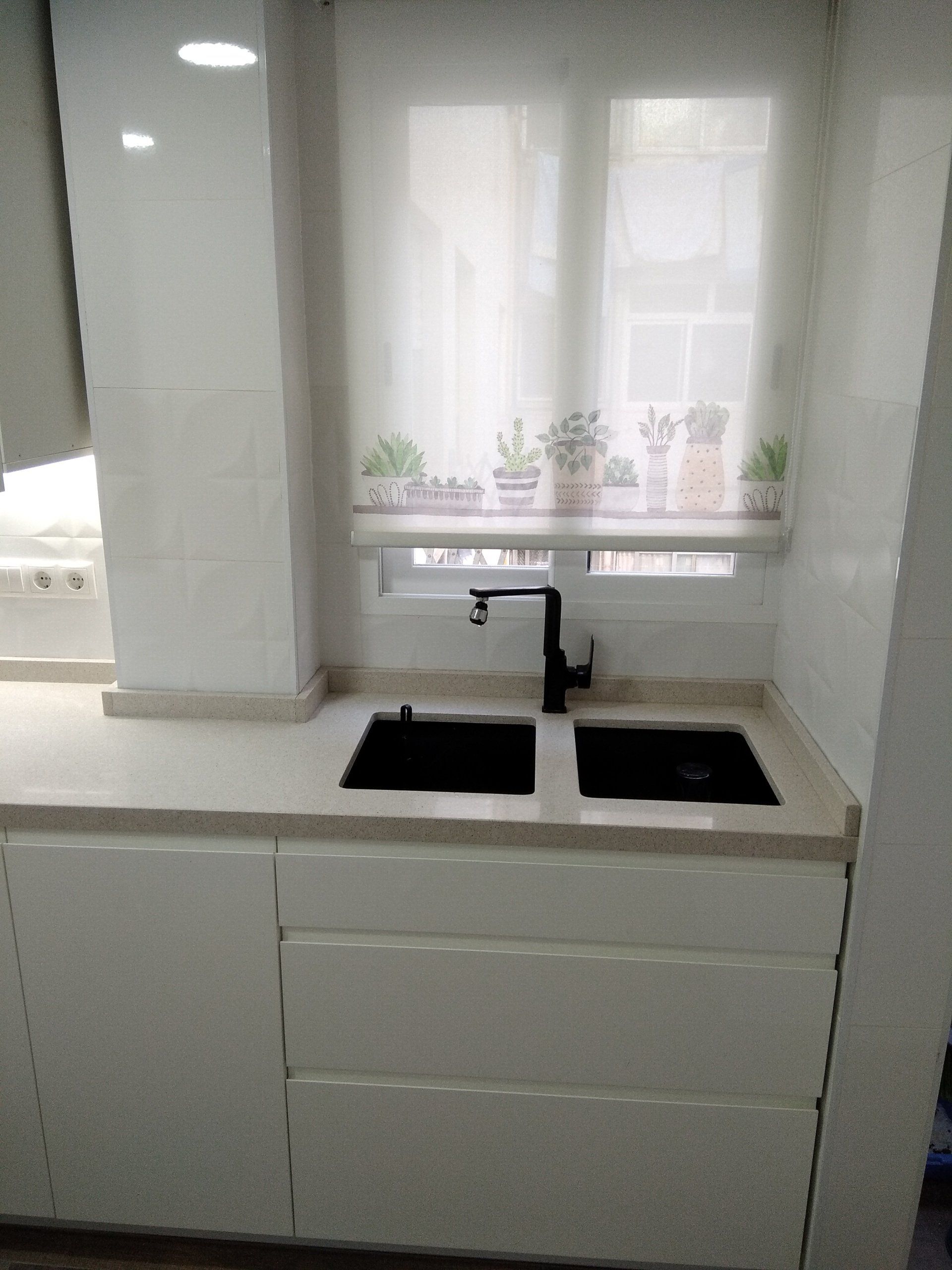 Se han utilizado revestimientos porcelánicos en blanco brillo, un frontal decorativo y un pavimento imitación madera. Armariada en serie LUXE blanco brillo con gran capacidad de almacenaje, tiradores tipo uñero, lavavajillas integrable, pila encastrada, columna de horno y microondas, tira de led encastrada en la armariada, conexión de televisión, dos ambientes de iluminación, bancada de granito de 4 cm de canto, colocación de pladur.