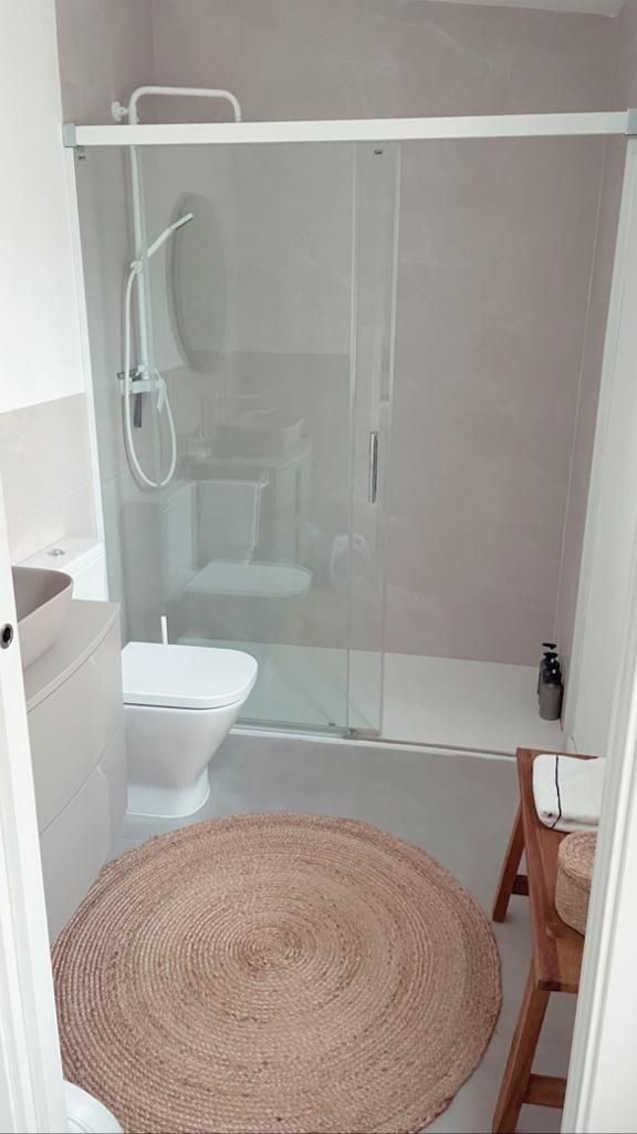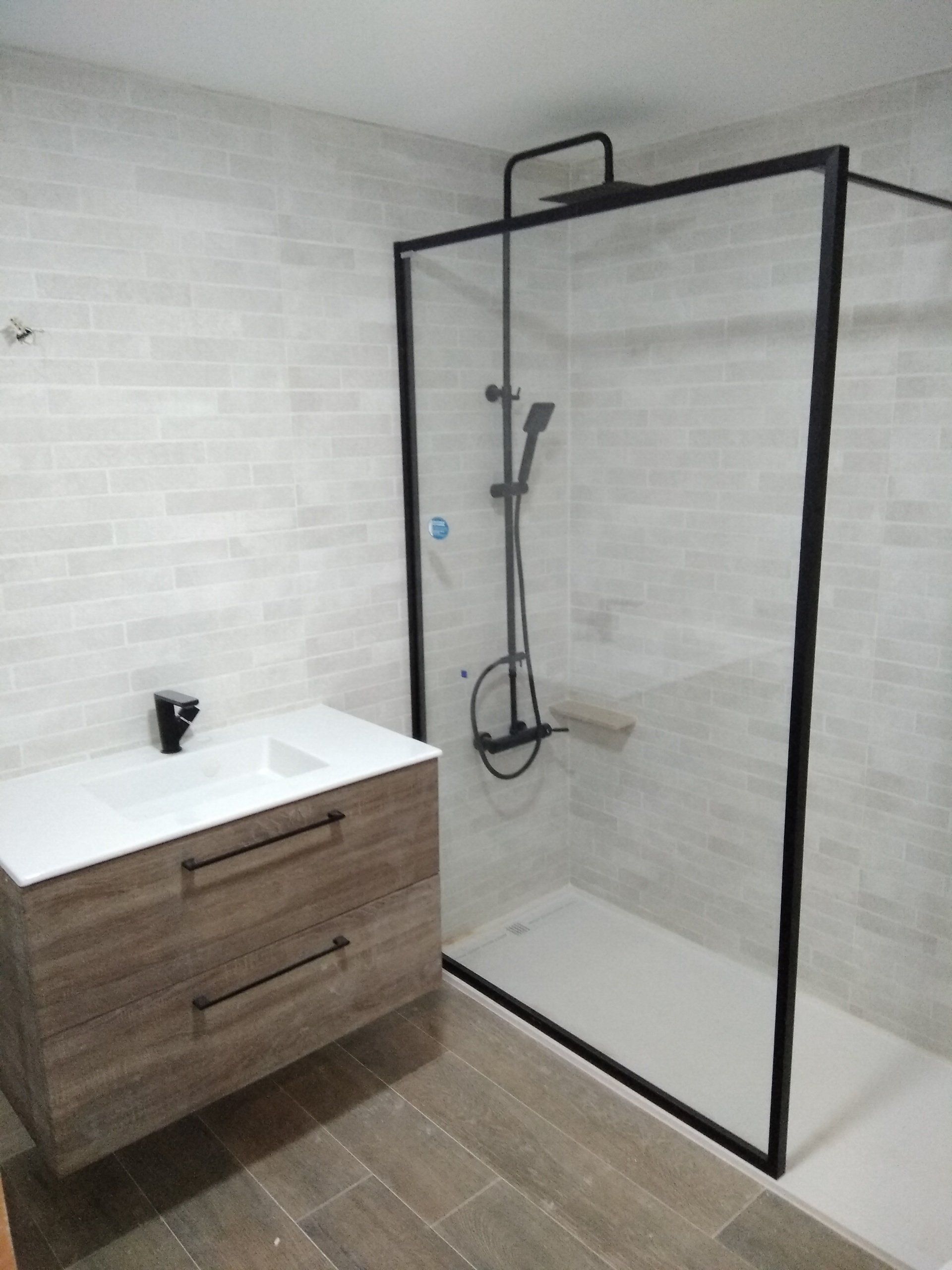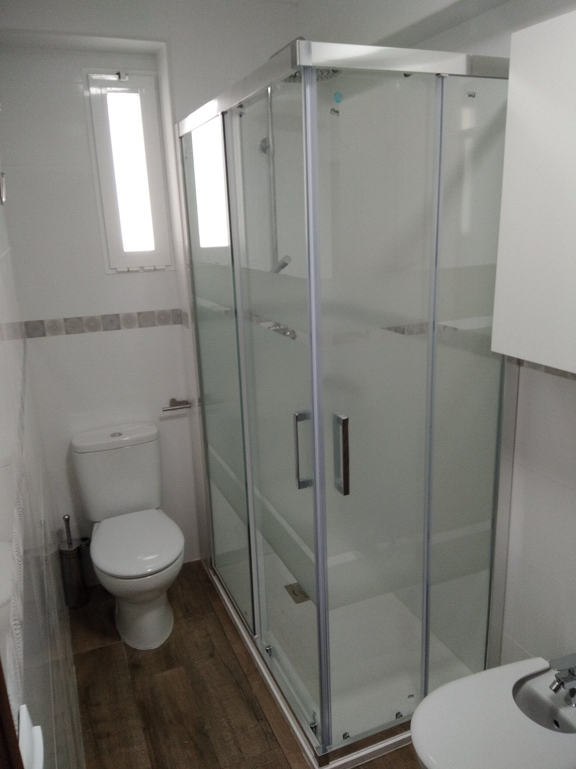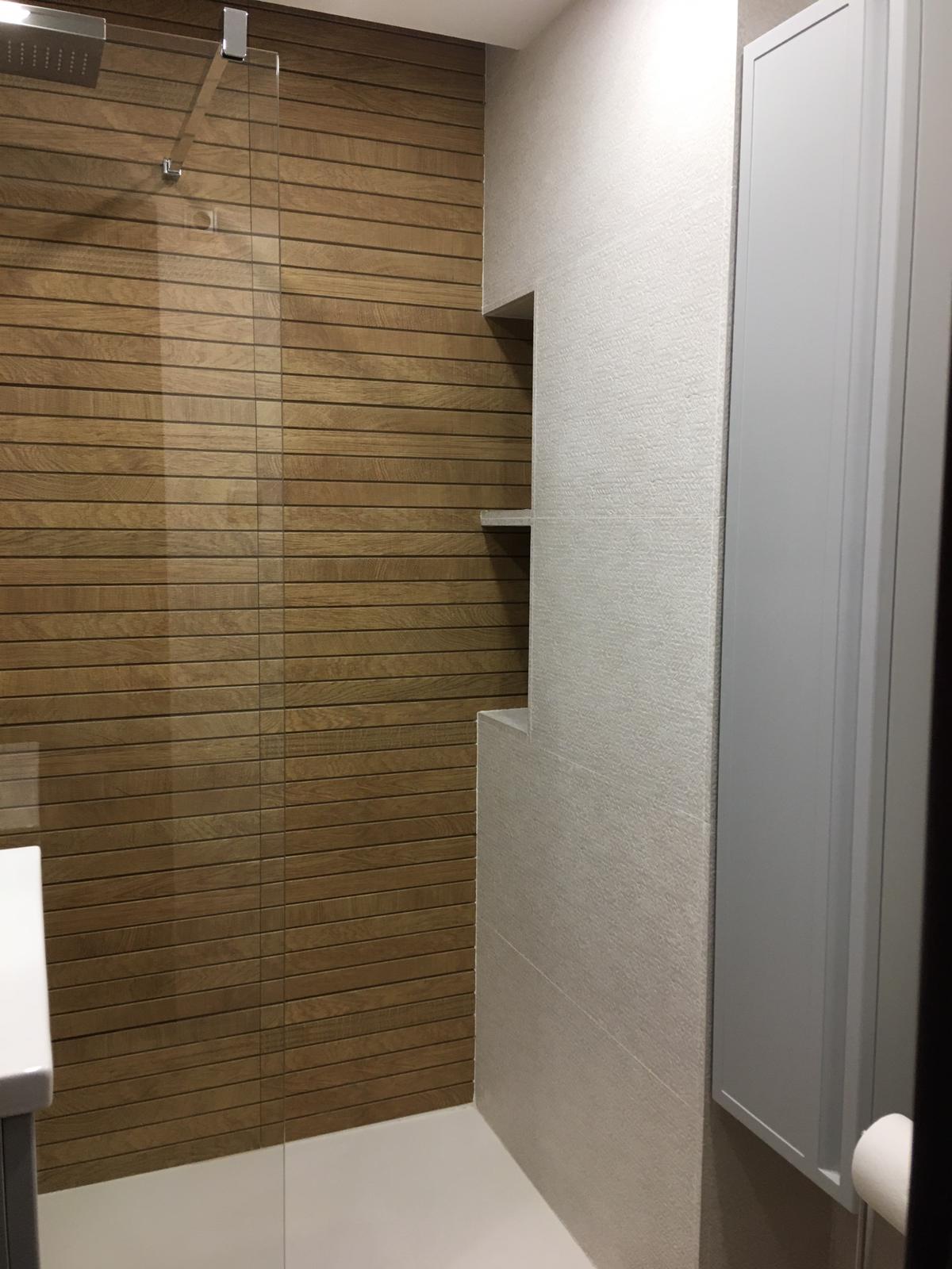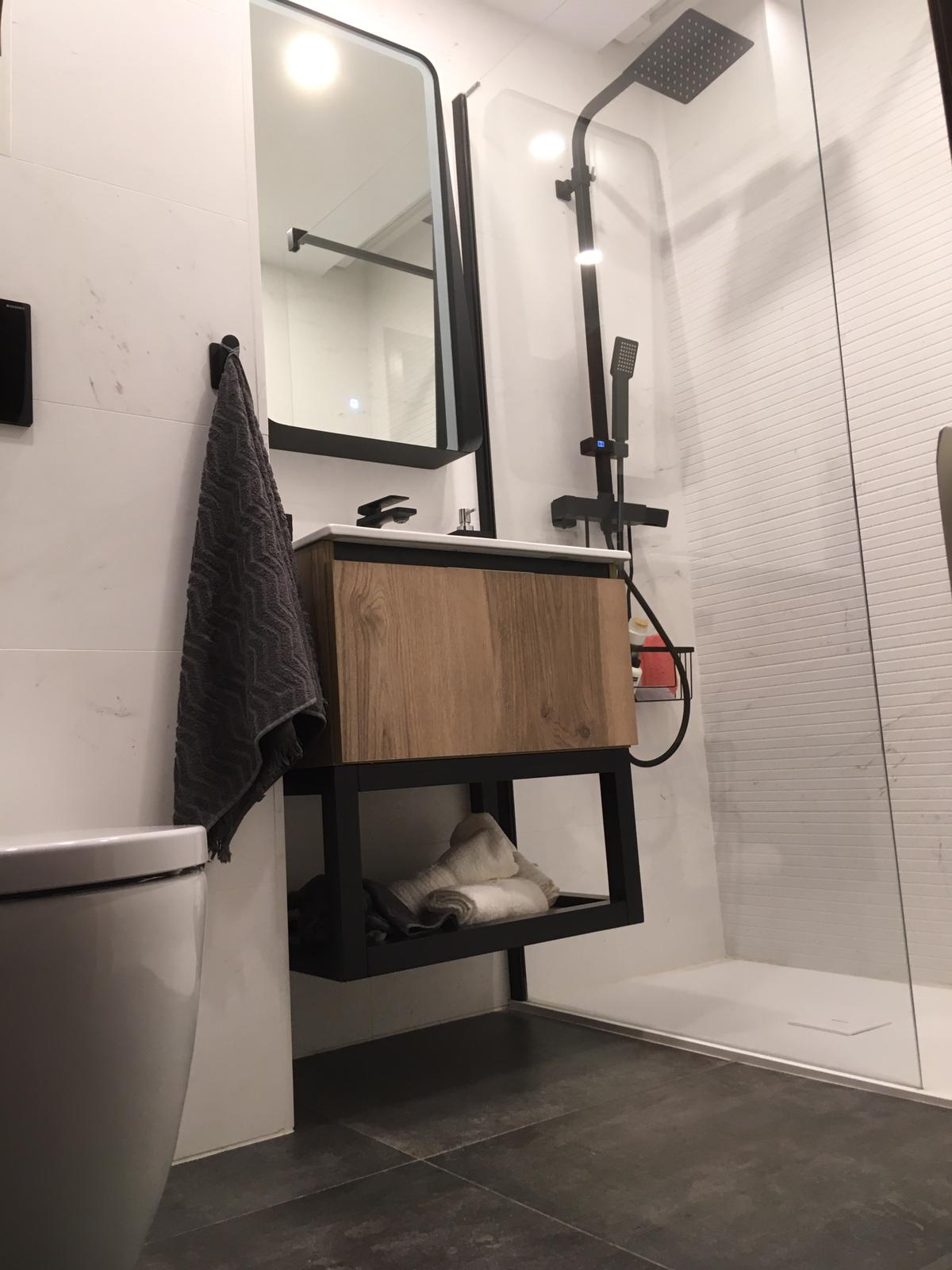 Reforma integral en cuarto de baño. Sustitución de bañera por plato de ducha. Alicatado con piezas de gran formato en blanco brillo, pavimento porcelánico imitación madera y cenefa decorativa. Inodoro, bidé con tapa, mueble de baño volado con dos cajones de gran almacenaje y mampara de cristal con cierre en esquina.