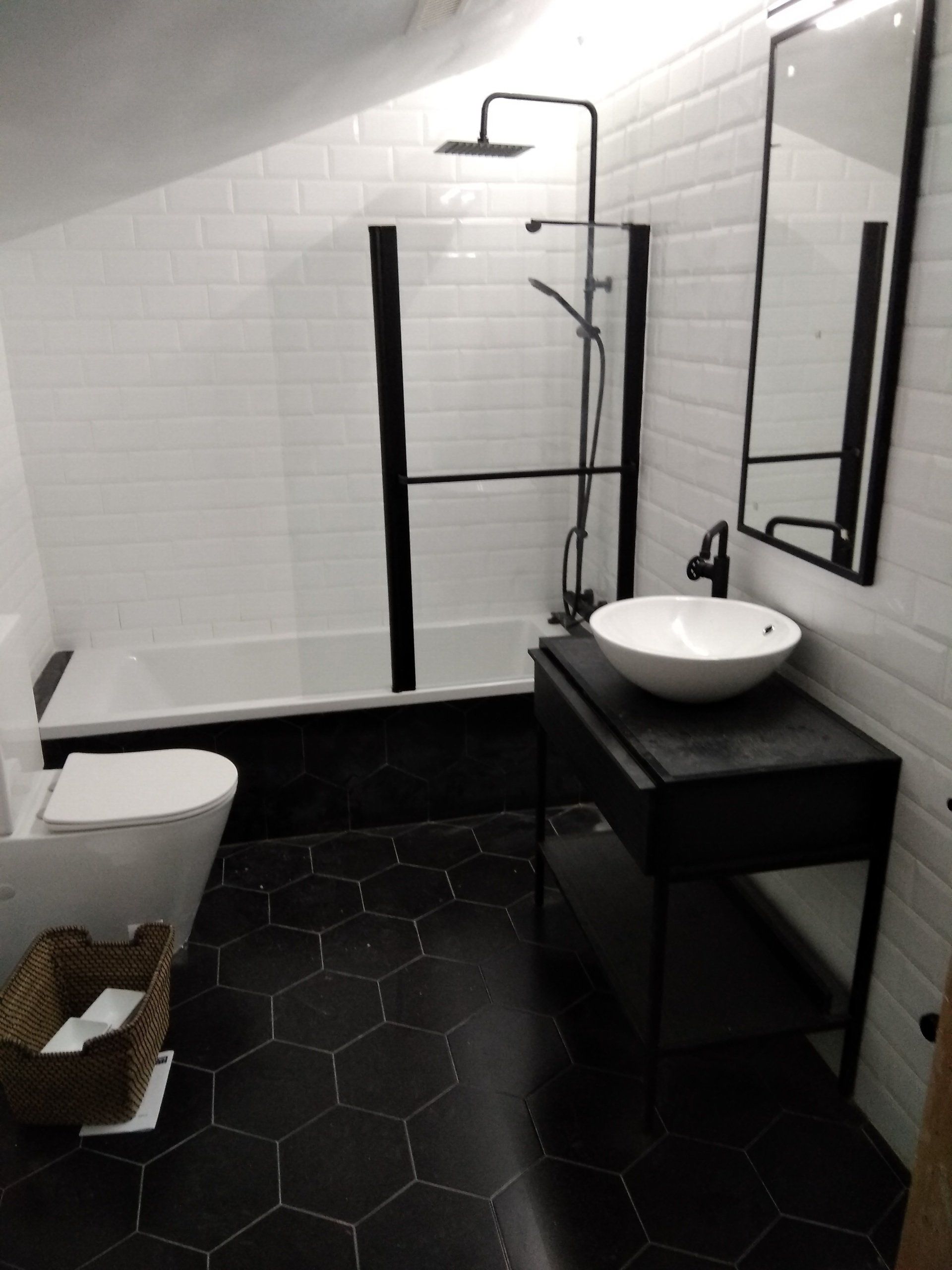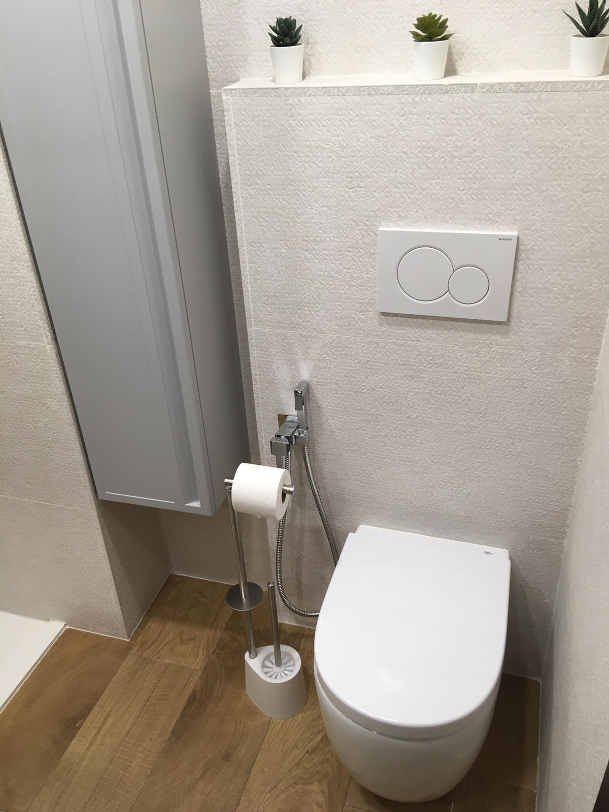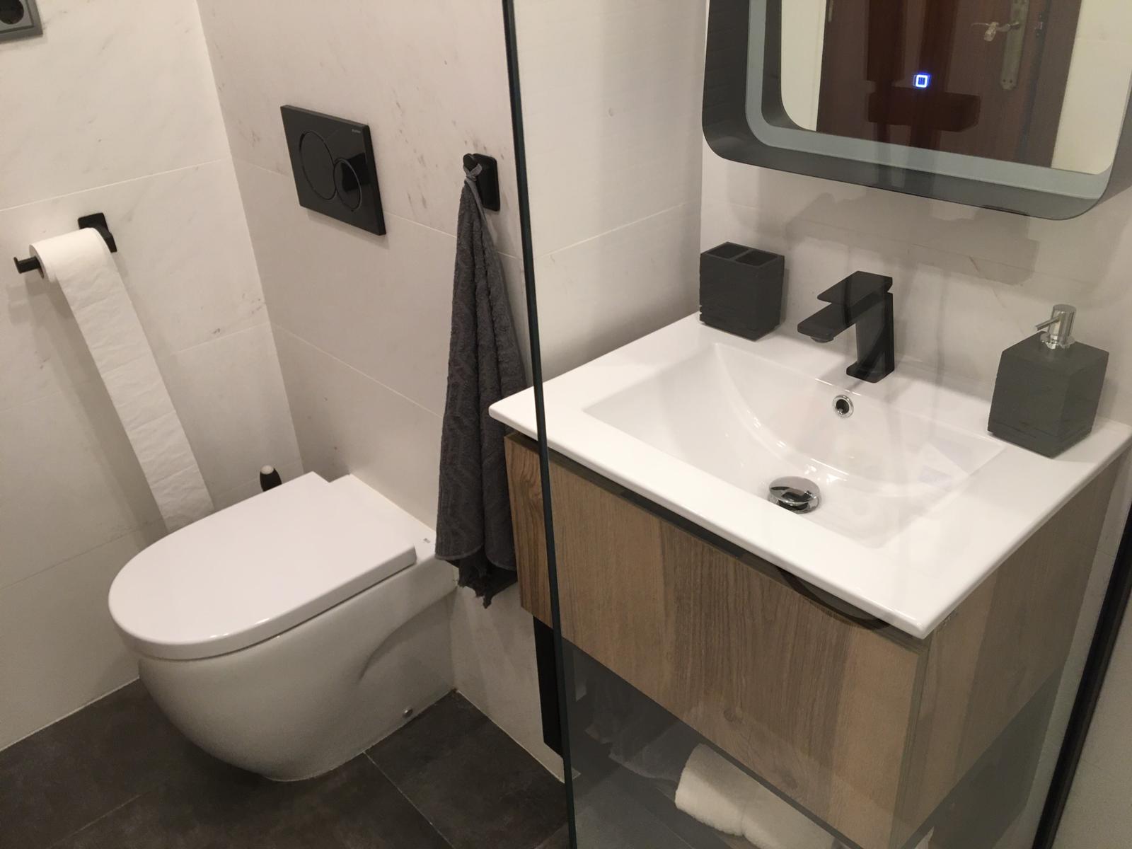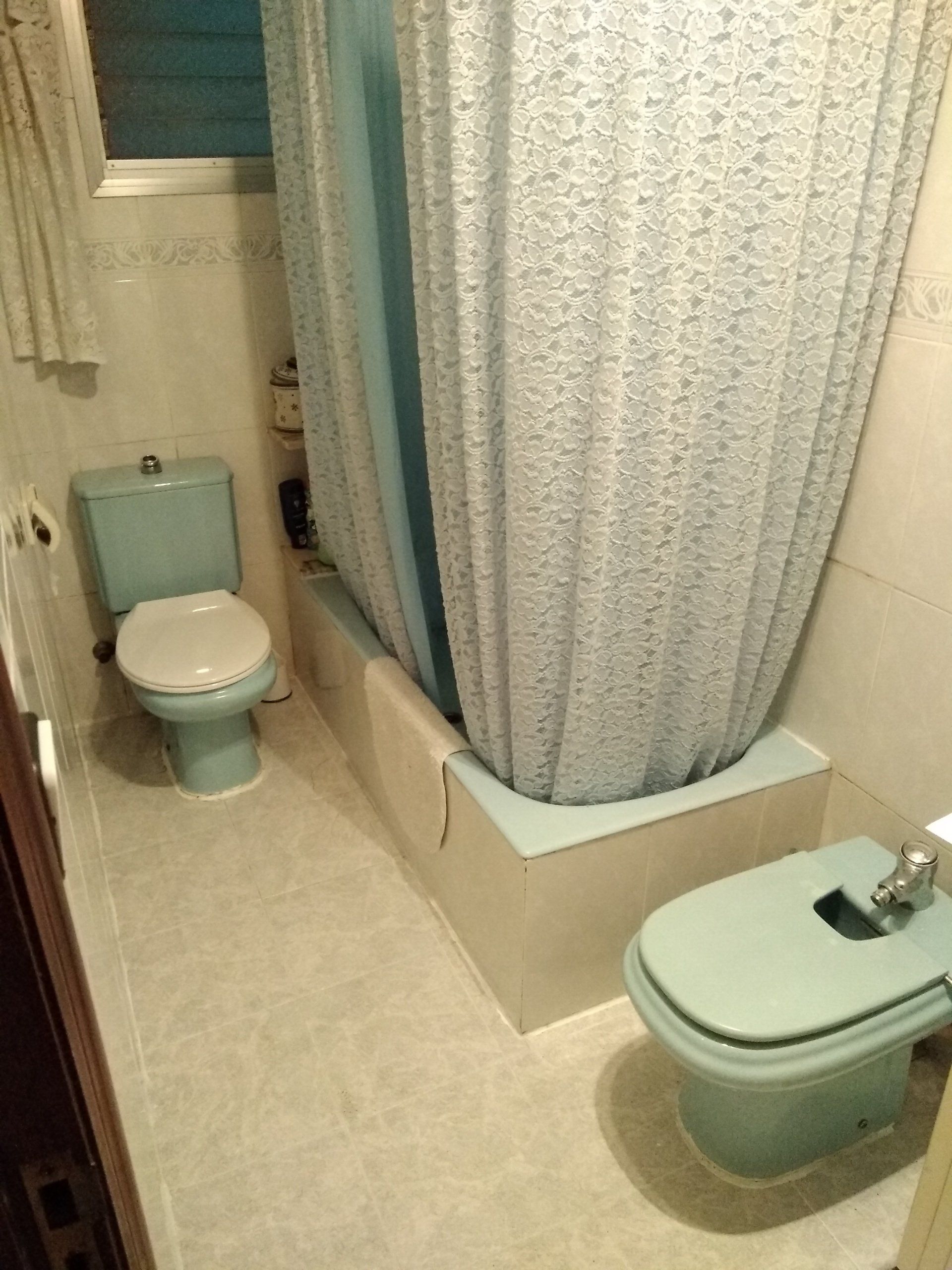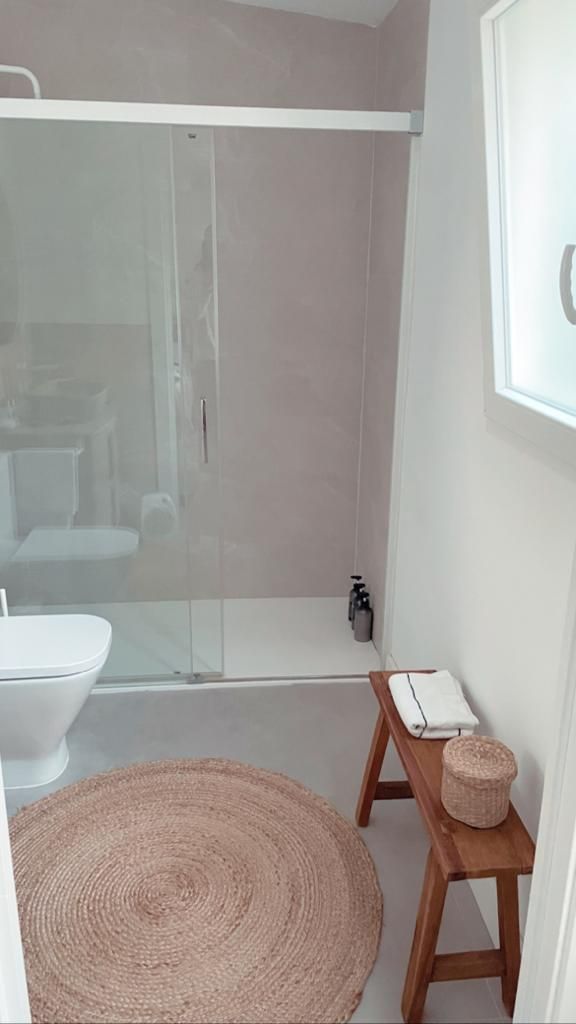 Reforma integral en cuarto de baño. Sustitución de bañera por plato de ducha. Alicatado con piezas de gran formato en blanco brillo, pavimento porcelánico imitación madera y cenefa decorativa. Inodoro, bidé con tapa, mueble de baño volado con dos cajones de gran almacenaje y mampara de cristal con cierre en esquina.